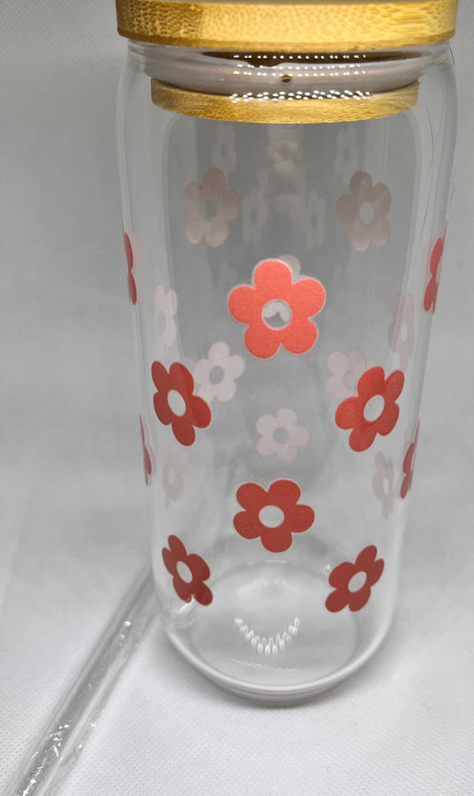 Pink Flower Glass Tumbler with Straw & Cleaner – 22oz Drinkware