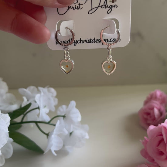 These 18K gold plated or platinum plated huggie hoops feature a gold or silver plated heart charm with a real mustard seed inside. They are lead and nickel free, lightweight, and comfortable for daily wear. The anti-tarnish finish helps keep them shining longer.